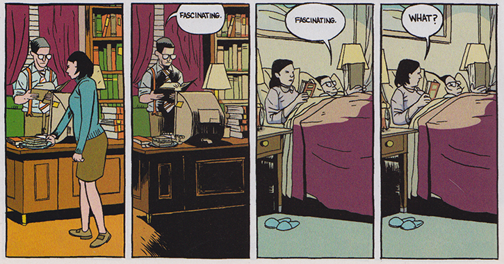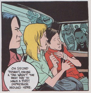 At the risk of making this installment too long, I also want to bring up the aside involving the professor of robotics. In three straight pages broken down into three rows of four panels, Dalrymple renders a compelling and compact thread of the story. Omega the Unknown follows a delivery truck for a FedEx-type company called “2U Quik.” Earlier we see the zombie-like driver in a traffic scene, but here the focus on the delivery of a book entitled Robotics: What Comes Next, which the unnamed and unsuspecting professor begins to read. The repetition of the panel size and the slight changes to shading, coloring, and detail, work to evoke both the creepiness of what is happening and the passage of time. In panel after panel we see the professor reading and reading, punctuated only by his occasional mumbling of “fascinating.” We see him ignore the lunch on his desk. We see him reading the book propped up on his chest all through the night as he lies in bed. When he wakes up the book is attached to his chest, and seems to be slowly integrating into his body. His wife says she’ll call the doctor, but the prof seems unperturbed. He puts his clothes on over the book, and goes through his day lecturing and grading and meeting with students like normal. By that evening, all of the book, save the spine, has disappeared into his chest. His wife tells him she’s made an appointment for him to see the doctor, but he replies “that won’t be necessary.” There is clearly something weird going on here, and the part of the 2007 version of Omega the Unknown that feels the most original and intriguing. It is here that the comic book distinguishes itself as more than just a riff, and the art and sharp writing are what accomplishes that.