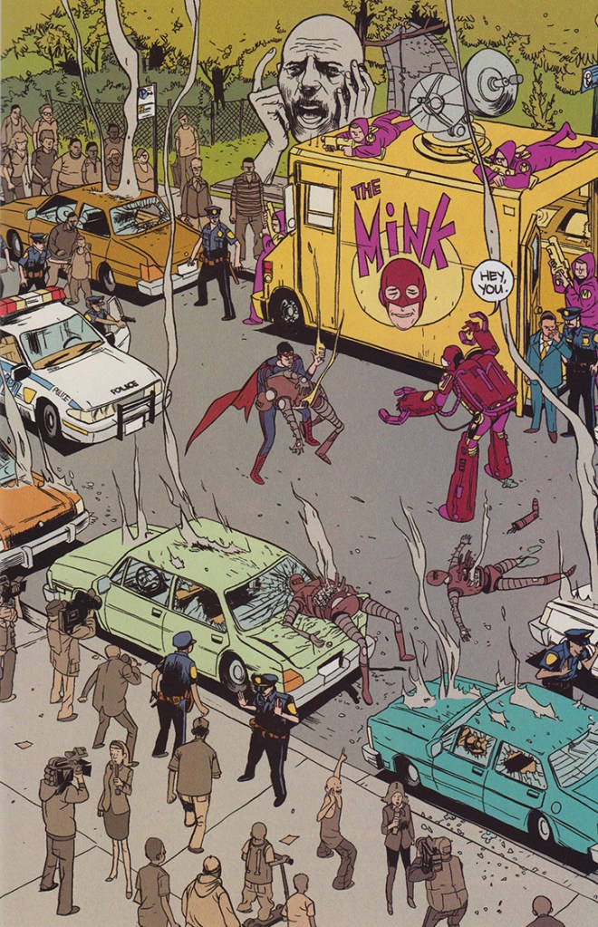 Instead, the issue, still paralleling the 1976 series, focuses on the boy’s encounter with his new neighborhood. In this case it is not Hell’s Kitchen, however (too gentrified by 2007 to serve the “bad neighborhood” narrative), but Inwood, a small predominantly Dominican neighborhood at the very northern tip of Manhattan. Lethem and Rusnak even invent local Sammy Sosa High School as a signal about who lives there, which I guess is preferable to the catcalling Puerto Ricans and winos. They mostly leave it to Dalrymple’s art to provide the vision of the neighborhood. The art depicts the closely-packed tenement buildings of uptown, or looks down at their irregular rooftops. It gives us storefront churches and food trucks. It may linger on the graffiti and garbage of Edie’s building’s “neglected” hallway, but it does not make urban crisis the focus. That does not mean, however, that the comic book always has a softer touch in referencing a racialized framework for evaluating the neighborhood. For example, when they drive by Sammy Sosa High School in a taxi, Dalrymple draws the dark faces of students outside the glass, yelling and banging on the window Alex cringes in fear. Still, at least this is not the only representation of urban youth Dalrymple gives us. The opening panels depicting Omega in a trainyard deconstructing the robots from his fight at the hospital to better trace them, includes lovingly rendered images of kids painting old school subway art, including a top-to-bottom whole car piece depicting Omega himself. Lethem’s brother is actually a fairly well-known graffiti artist from back in the day, and graf also plays a large role in the narrative of The Fortress of Solitude. It was nice to see this echo here, but as we shall see when we discuss the Mink, it also connects Omega and his heroism to a marginalized culture, as opposed to his publicity hound opponent. Not only do the people who know your name in the graffiti world have to be paying attention to that invisible but ubiquitous world, but they don’t even know who you really are. You gain notoriety, but remain unknown.