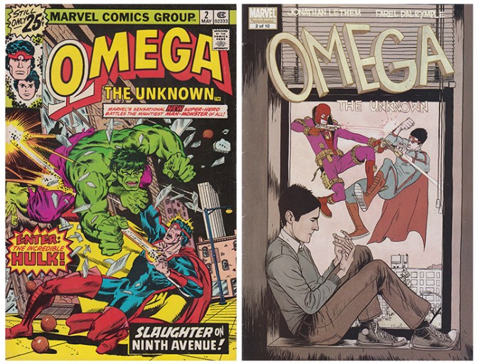Farel Dalrymple’s cover for his Omega the Unknown #2 is definitely better than his first, and I like it better than Rich Buckler’s cover for the 1976 version. As much as I love the Hulk, having the comic center on his presence, especially after only one issue, seems like too transparent a demand of marketing. Still. I appreciate the tension between the bombast of the cover image and the more thoughtful interiors. Sure, Omega and the Hulk do battle, but ultimately, the conflict is on the periphery of our focus: James-Michael Starling. The Dalrymple cover highlights thoughtfulness by putting Titus Alexander Island in the foreground, staring at his hands, while Omega and the Mink do battle outside the window behind him. This image is a better representation of what goes on within, and is a cleaner, simpler cover that evokes the comic’s themes.
