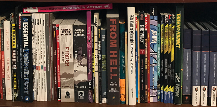 AG: Not really, but mostly because when I think “comics collector” I think of someone who collects single issues, and I don’t do that much. My husband and I (He’s a comics nerd, too) have a pull-list at our local comic book shop, but we usually donate the floppies to our nephews or friends once the trades come out…except for the handful we get signed.