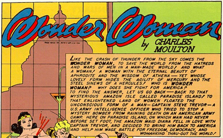 AG: I mean, in Diana’s origin story, she goes off to help Steve in the comics because she’s convinced of the US’s specific moral rightness. In the intro to Sensation Comics #1, we’re told, “The Amazon Diana fell in love with Steve Trevor and decided to bring him back to America and help him wage battle for freedom, and democracy, and woman-kind through-out the world!” Plus, her outfit is a specific call to American symbolism, with the eagle and the star-spangled culottes.