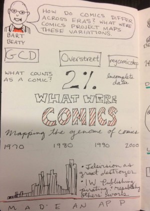 I am not even sure of the best way to cover this event. Bart Beatty (of Twelve-Cent Archie and Comics Versus Art fame, among many other books and articles) began with an overview of the work he’d been doing with the help of post-docs and grad students and a generous grant from the Social Sciences and Humanities Research Council of Canada. The idea is to take a sample of 2% of all comics published between 1934 and 2014 in order to develop an understanding of the evolution of stylistics at any given era in those 81 years, by coding their formal elements. The idea is to construct a history of comics based on a sense of the “typical” rather than the exceptional. The presentation was fascinating, but a little frustrating. The project seemed to eliminate some comics from this history rather arbitrarily. Beatty uses the Overstreet Guide (which is notoriously prone to ignore the vast majority of underground comics) and the Grand Comic Book Database (which is put together by fan and scholar volunteers—kind of like Wikipedia for comics). It is a fantastic and fascinating project, but I worry (and I think some others in the audience, and I hope Beatty and his helpers also worry) that it will unintentionally recapitulate some of the problems with legitimacy and erasure in comics through the choice of sources. Still, he’s right overall; comics studies will benefit from expanding our research methodology.