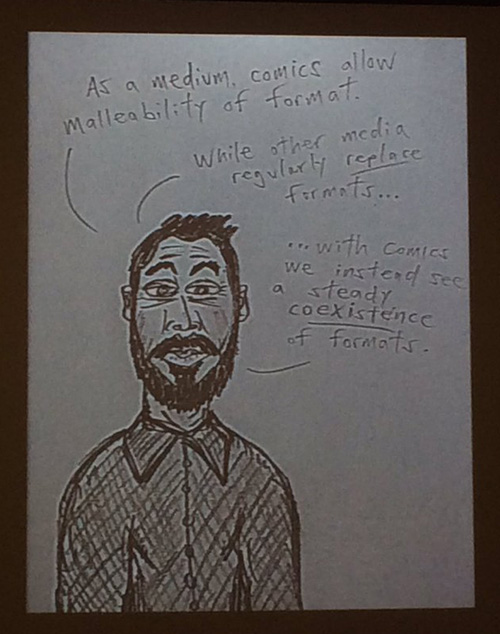 After a short break, there was a Pedagogy Roundtable featuring Professor Nick Sousanis of San Francisco State University sponsored by the Comics Studies Society. You may have heard of Sousanis because he wrote/drew his dissertation in comics form. It garnered quite a lot of press (lord knows, everyone and their brother sent me a link to a story about it) and if you have seen it in book form as Unflattening, you understand how brilliant the work really is. The roundtable took the form of a presentation by Sousanis about using comics to teach, followed up with responses by a panel made up of Qiana Whitted, Frank Bramlett, and Brittany Tullis.