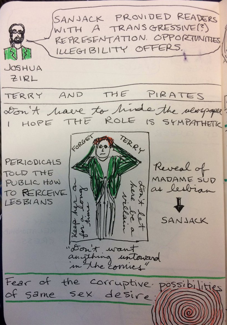 All three papers were fascinating. Jeremy Stoll presented on a queer comics anthology funded through Kickstarter in India, and discussed the range of expressions of that experience, but also the limits and problems with trying to publish them both in terms of economic constraints and in the context of the extreme homophobia and strident sexual mores common to the communities where these comics makers live. Margaret Galvan amazed us with her archival work regarding Alison Bechdel’s work with local gay periodicals across the country, and connecting her comics to a history of queer production that is obscured by its scattered grassroots contexts. Josh Zirl illuminated the story of comics’ first lesbian character, Sanjack from Terry and the Pirates. He examined reader response to the character, which led him to claim that the character, despite her villainous depiction, provided readers with transgressive opportunities for representation and identification offered through the character’s illegibility as “lesbian” to those not already open to the idea of same-sex love. It was great work all around.