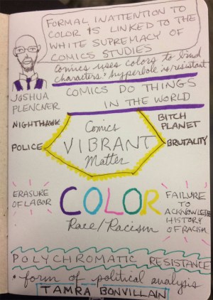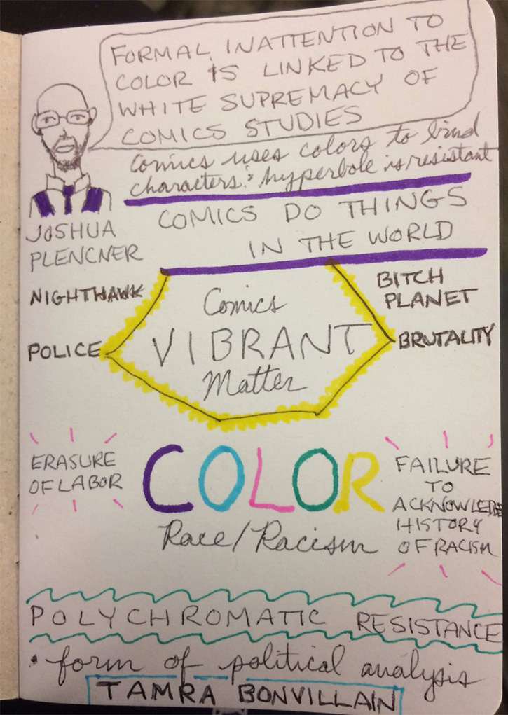 …particularly because I was eager to hear Joshua Plencner’s talk, and I wasn’t disappointed. More than anything Plencner’s talk was a call to action for comics scholars to theorize color more, hell, at all. As he said, even black and white comics are named for two colors! And, since he is putting this notion to work in considering how race is represented, it speaks to my own area of interest with that much more weight. As he said, “Formal inattention to color is linked to white supremacy in comics studies,” and that we need to think of a “polychromatic resistance” to that invisibility of color. (You may remember Josh’s guest post on Logan and Ultimate Wolverine). Keith Friedlander’s presentation was also inspiring, though in a much more specific way, in that his look at the young world of Young Avengers as a counterpublic, got me thinking about my own desire to write about Gillen and McKelvie’s run on Young Avengers in relation to the complexities of adolescent maturity.