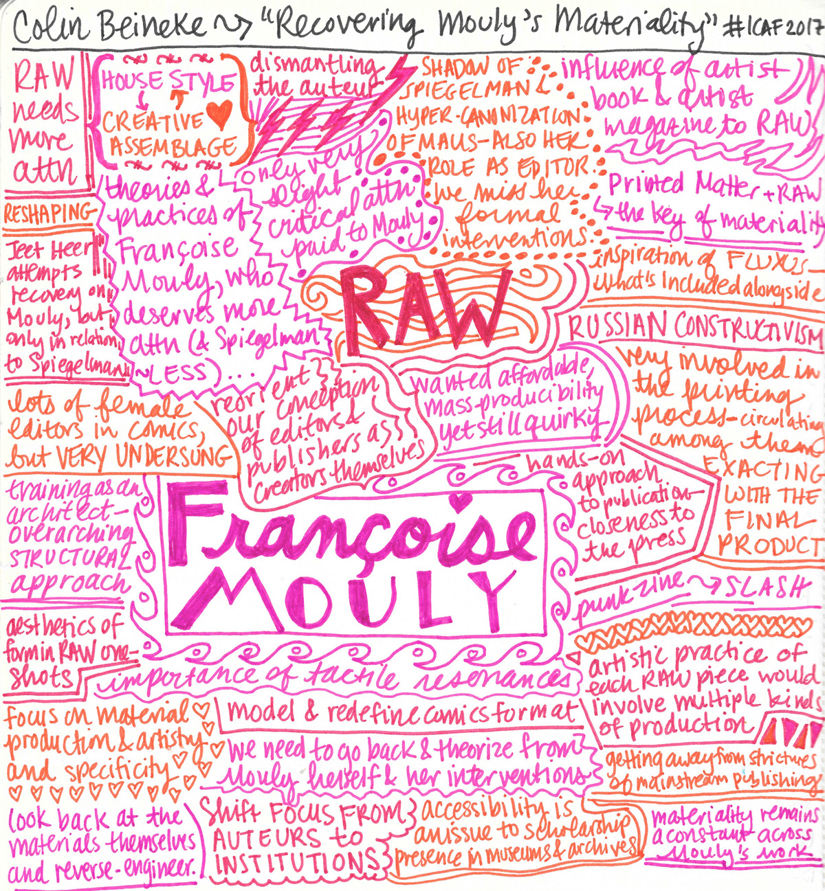 This year’s talk was entitled, “(Re)covering Mouly’s Materiality,” and discussed the possibilities of editor-as-auteur through the figure of Françoise Mouly, and in context of how her great work in comics too often exists in the shadow of her more famous husband, Art Spiegelman, and the other artists she shepherded along and helped to shape as co-founder of RAW. As Beineke rightly pointed out, even the punning title of Jeet Heer’s monograph on Mouly—In Love With Art—suggests her work only has meaning in relation to a man. Ultimately, Beineke argues that paying attention to house style as the result of an editorial artistic endeavor can reframe and recognize women in the industry. Furthermore, he suggested that comics studies needs to pay more attention to the modes of comics printing as to uncover the details of that influence.