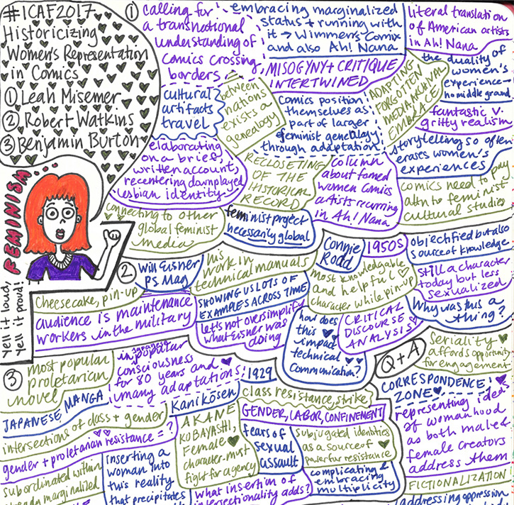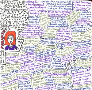 One of my favorite aspects of this conference was the activity on Twitter. Using the #ICAF2017 hashtag, attendees shared insights from each other’s presentations, discussed topics tangential to presentations, and posted pictures of presenters and of their own notes and sketches. Among these, the notes Leah Misemer and Margaret Galvan shared were most notable, colorful and concise. I ended up using them to help remind me of elements of the presentations, and reproduce some of them here (with their permission). You can see all of Leah’s “sketchnotes” on her Twitter feed, and Margaret’s can be found in the notes section of the art page at her website.