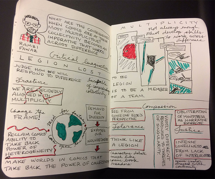 Ramzi’s talk—“Legions of Superheroes: Multiplicity, Diversity, and Collective Action Against Genocide in the Superhero Comic Book”—was as amazing as I expected. He presented a deep dive into DC Comics’ 2000-01 Legion Lost maxi-series by Dan Abnett and Andy Lanning, with art by Olivier Coipel. Ramzi used the series as an example to consider comics when they are at their most multiplicitous, and how as a result collectivity is imperative in building connections across difference. The talk was too erudite, ranging, and sharp to give it justice here, but as usual Ramzi was provocative and brilliant. His focus on heterogeneity as opposed to the tokenism common to representations of diversity, forces us to think about the limits of the discourse of diversity, and how comics are positioned to be the best way to articulate the reality of radical difference and utopian possibility.