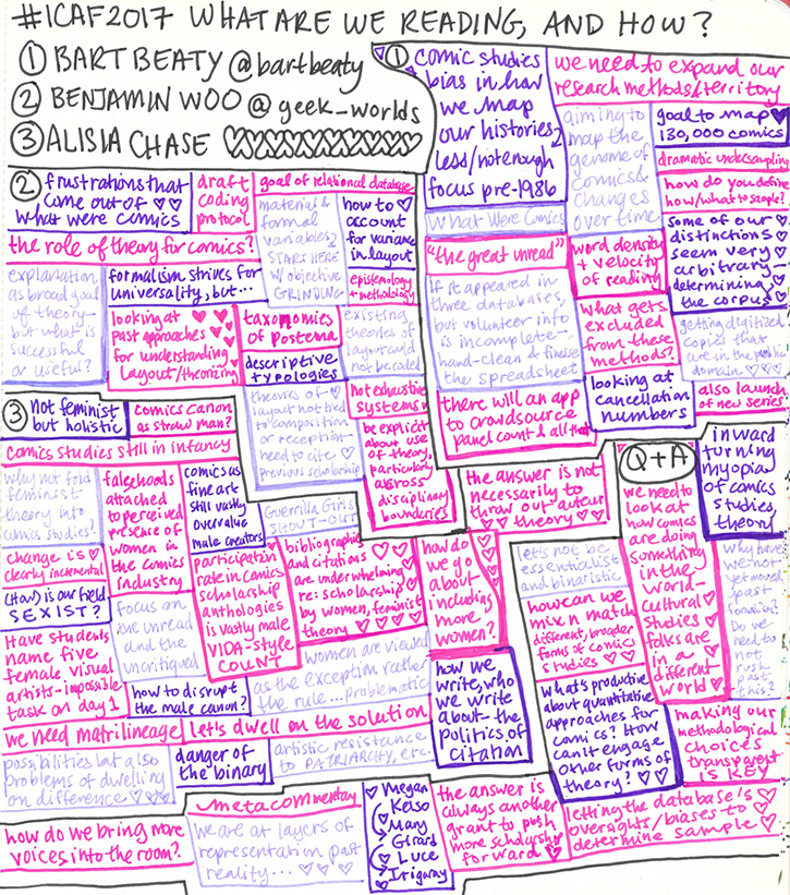 As soon as her presentation was done, Ramzi Fawaz had his hand in the air to ask a question, and when called on by the moderator, prefaced his own comments with “I’m going to be combative here…” From there things get hazy again, but despite the extreme discomfort that followed, I did appreciate that people felt so passionately about what’s at stake in comics studies and about being inclusive in intersectional ways. After challenging Chase’s strange choice to foreground her talk with what sounded to most of us like reductive gender binary essentialism, (despite, I think, that not being her intent), Ramzi impugned most comics scholarship and expressed his skepticism of the Calgary School of Comics Studies project, characterizing it as a universal theory of comics, and saying he was wary of any system divorced from cultural and political consideration—“I am much more interested in what comics do in the world, than an inward-turning myopia of comics studies.” This makes sense to me, because as much as I have a love of numbers and data, ultimately, I am less concerned with that aesthetic formalism as others in my field are. That said, I also think calling what Beatty and Woo described “a universal theory of comics” is a mischaracterization. It is an effort to use data to rethink the way we periodize comics and describe their typicality in association to time. This is something that could be really helpful in developing an agreed upon nomenclature for comics scholars. However, as I suggested above, my concern is the way that that very data is collected and organized could reinforce some problematic ways in which art and letters have been canonized, so an awareness of difference and power is crucial. As an example, as one attendee pointed out, the very dynamics of the contentious discussion were very gendered in the way that more men than women were speaking.