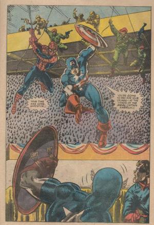 BC: I love it. It’s the one that ends with the original Cap and Spider-Man leading a cadre of black radicals. Including Sam Wilson, who is still in his “Snap” persona.