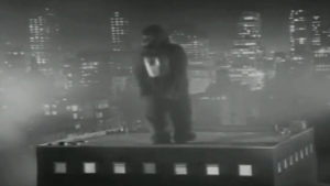 Thus, the video for Cherrelle’s “I Didn’t Mean to Turn You On” exists in a weird tension. I guess it would be possible to read the video as elevating Cherrelle to the position of white woman by having her be the focus of Kong’s desire, but I am not sure I buy that, or even want to, as it’d reinforce that disgusting racial hierarchy. Instead, I imagine that the director, Bill Parker, didn’t put much thought in the scenario save for the comedy of putting the ape into the context of having been led on by reading the signals wrong. Still, by having Cherrelle play the part of the pith-helmet-wearing explorer who finds Kong, the video not only grants her an agency that Ann or Dwan never have, the video’s story depicts the singer as compassionate and kind, bandaging the ape’s injured finger and being friendly, even motherly, to it. In this version of the King Kong story, however, the ape leaves the island of his own accord, hunting down the woman. While the video tries to play things light by including animated settings and having Kong pop, lock and break on the roof of her building during the musical interlude, it still ends on dark image. Cherrelle seems to give in, overwhelmed and swoons into a faint. This really reinforces the danger she is in, and I think the video-maker saw it, too, because the final scene of the video has Cherrelle awaking in bed, a copy of what looks like a King Kong magazine or comic in hand, suggesting she fell asleep reading it. A switch from black and white to color indicates that we are now in the real world. However, her facial expression suggests that this troubling dream reflects her real-life circumstances, even if they don’t actually involve giant apes.