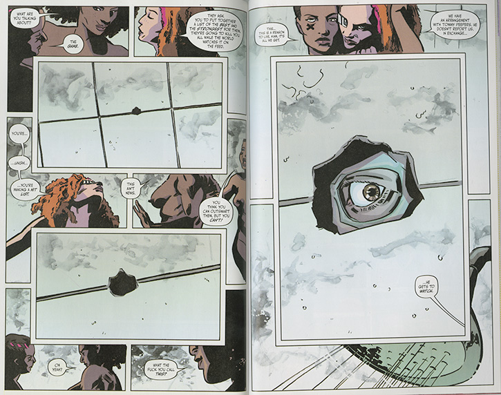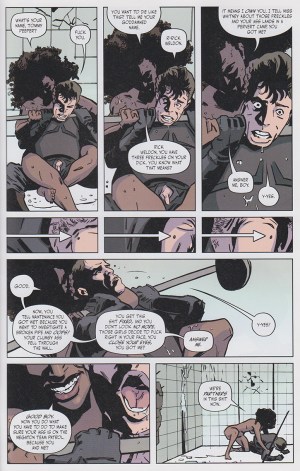 The prison shower seems to be a pivotal place in the carceral geography of Bitch Planet; especially for black women. It is the location in Bitch Planet where the stereotypes of the Blaxploitation films that inspired DeConnick and De Landro are turned on their heads. Their tongue in cheek naming of the chapter, “The Obligatory Shower Scene” in issue #4 is a nod to many of the pop culture influences of the series. In the chapter, Kamu (nicknamed “Kam”), a former athlete, framed for murder, is trying to negotiate prison culture, while recruiting women to play in a blood sport game called Megaton. The art within the entire book, but this set of panels in particular, lovingly portrays the bodies of realistic looking women of all shapes, colors, and sizes. The women allow a male guard, Rick Weldon, to engage his peeping Tom fantasies by watching them shower through a tiny jagged hole; in exchange he agrees not to report their clandestine activities and conversations. Later, Kamu baits him by playing at deliciously masturbating, ultimately she pulls him through the wall and nearly kills him with a shower pipe. She reverses his exploitation by threatening to rat him and his “tiny freckled penis” out for perversion. His fear of exposure is so great that he agrees to help her get information and find her sister.
