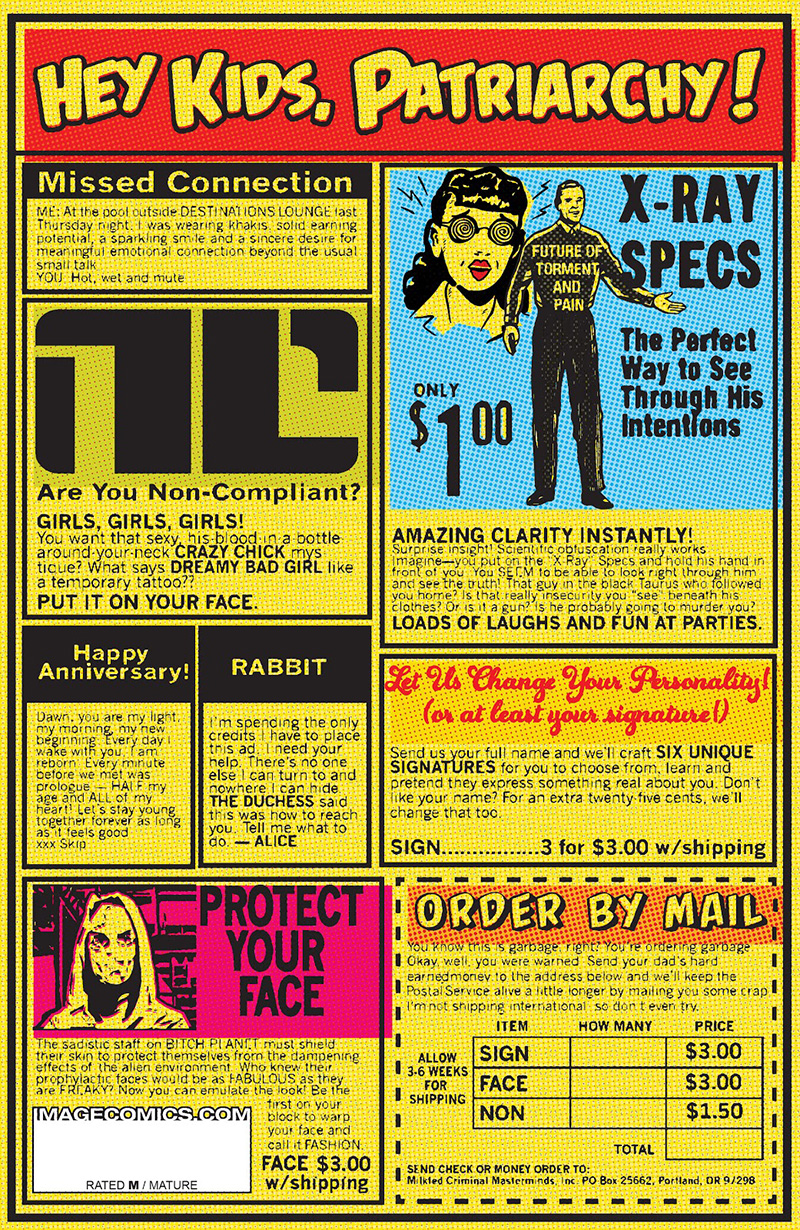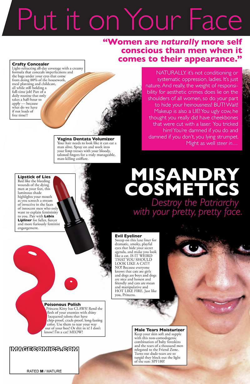 As the series progresses, the ads transform. In the second issue of Bitch Planet, there is an ad for a “3-D Gyno-coin,” with which one can hypnotize a man into being repulsed by women he likes. The back cover of Bitch Planet #3, which features Penny Rolle’s backstory regarding her imprisonment for accepting her own fat body, features many such ads including one that at first seems to be about weight loss via body parasites. However, a close look at the ad text reveals its subversive message that women should refuse to harm their bodies to fit an outsider’s standards of beauty. The message in the ads in the early issues of Bitch Planet are about shaming women into changing their personalities or bodies to appeal to men. As the women’s resolve to escape solidifies, the ads change. An ad in the seventh issue of Bitch Planet is reminiscent of those in the 90’s or the early 2000’s. Whereas the ads earlier in the story didn’t have any pictures of people and were all cartoonish, this ad is the first to include the picture of a woman. The ad is about destroying the patriarchy through makeup, such as “Evil Eyeliner,” “Male Tears Moisturizer” and “Poisonous Polish.”