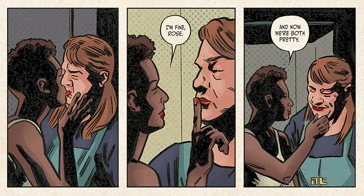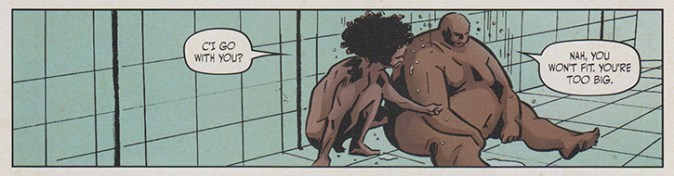 In issue #7, “President Bitch: Part One”, we see Kam in the showers with Penny who is sitting on the floor under a soft spray of water. We see Kam squat next to Penny and try to talk her out of the guilt she is feeling for the death of another inmate and friend named Meiko. Penny silently acknowledges Kam’s kindness through a moment of hand holding. Once she rises again she assumes the mantle of Penny Rolle, a proudly fat black woman raised to be strong by her grandmother, before the disciplining Fathers of the Auxiliary Compliance Outpost, known as Bitch Planet, intervened.