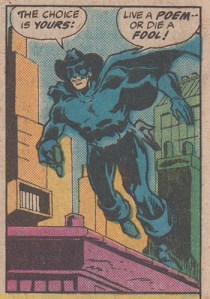 Blockbuster’s final words are about how he will snap Omega’s neck to prove that that blue-suited hero had given his best shot and failed and Foolkiller calls from off panel, “Pathetic isn’t it how they’re always proving something! Their strength, their cunning, how much they can drink! But never a poetic thought or word or deed!” He blasts the wayward father (making an orphan in the process), the Foolkiller’s pronouncements make him sound like a warrior against toxic masculinity (if only that were actually the case!). He then warns Omega from a rooftop that while he performed “very poetically” (not sure how, actually), the verdict is still out on him, and he might fall prey to Foolkiller. “The choice is yours:” he says in the final panel as he flees. “Live a poem or die a fool!”