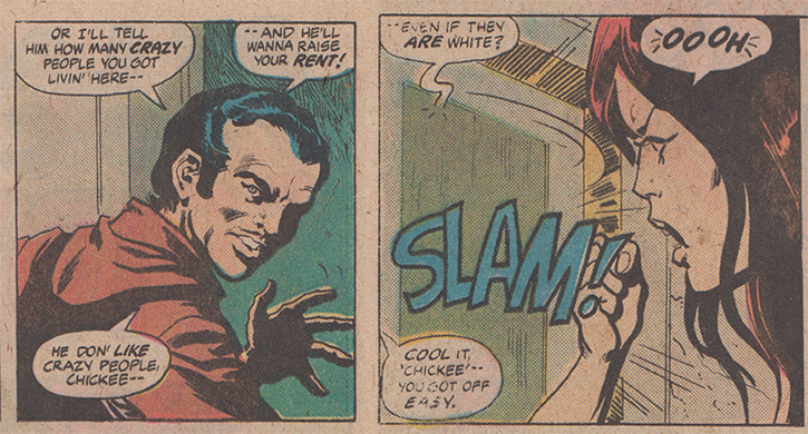 The only other event within the narrative of Omega the Unknown volume 1, #9 worth noting is the explicit reference to race coming out the mouth of a Puerto Rican stereotype. In what seems like an indulgent scene involving Amber wrapped in nothing by a bath towel, the super, drawn by Mooney to be something of a wide-faced caricature of a Mexican, arrives to announce there will be no hot water for the time being. I get that Gerber and Skrenes are riffing on the experience of living in Hell’s Kitchen in this era, but the exaggerated written out accent and the visual othering rubs me the wrong way. The only thing going for the depiction of the super is his snarky comment about the number of people they have crammed into the apartment as he leaves, saying, “He don’ like crazy people chickee — even if the are white.” Regardless, this comic has yet to present even one positive representation of a non-white person.
