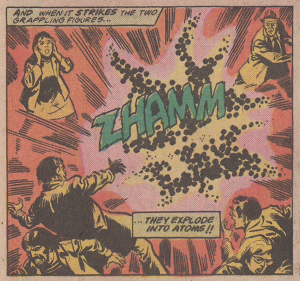 After being severely beaten and abandoned at the Rockefeller Center ice-skating rink, Omega returns to Hell’s Kitchen to find Blockbuster about to kill Gramps, who just happened to stumble upon the villain hiding in a back alley. Still beat up and exhausted, Omega is able to save Gramps, but is about to be killed himself, when “ZHAMM!” Blockbuster is disintegrated into a blast of Kirby krackle. The Foolkiller strikes again!