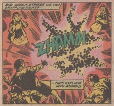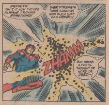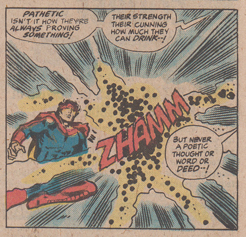 Even weirder than Gramps’s turn towards the vengeful is Omega’s sudden turn towards monetary concerns. He insists Gramps lend him all his savings—$300! That’s $1235.42 in 2018 dollars—without explaining what he needs it for and heads to the shopping district. The narration informs us he has found what he is looking for when he spots a fancy “navy blue 100% worsted Edwardian suit” in a store window. Before he can even get in the store, however, Blockbuster comes blasting out of a different store window. At first, Omega plans to ignore his former sparring partner, but the store owner offers a thousand buck reward to whoever can stop the supervillain, and the newly money-oriented hero decides that he has “a thousand good reasons to involve himself.” As they fight, the narration notes the irony that both men are fighting for “the accumulation of material wealth,” as Blockbuster explains that he is still trying to raise money to rescue his son from foster care. It seems like Gerber and Skrenes are working at forcing readers to consider the differences between those superhero comics present as heroes and villains, or really, the lack thereof. As the narration explains, “Mere circumstance, not principle, has cast [Blockbuster and Omega] as adversaries…And raw might, not the vagaries of justice shall determine who profits from their struggle.”