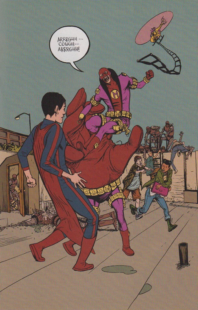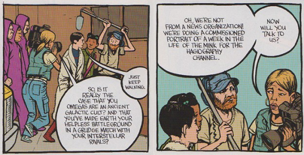 In 2008, Omega the Unknown volume 2, #9 opens with Titus Alexander Island back at Edie’s place trying out his new Omega costume in the mirror. Soon after, we see him mobbed by The Mink’s fuchsia-garbed henchmen and a documentary crew from the Hagiography Channel “doing a commissioned portrait of a week in the life of the Mink” as he tries to head out to where he can do the most good in the fight against the robot blight. The documentarian frames her questions for Alex from what is clearly the Mink’s prospective on what is happening. “Is it really the case that you Omegas are an ancient galactic cult? And that you’ve made Earth your battleground in a grudge match with your interstellar rivals?” Suddenly, the Mink’s sketchy behavior towards Omega, the kid, and the late Silliman Renfrew (that we were informed about last issue) makes sense. Yes, the MInk is a selfish boorish ass, but he is also (perhaps intelligently) unwilling to take sides in the Omega vs. robot conflict just because one side happens to look like what we recognize as a “superhero.” Of course, the fact that he refers to the “Omegas” as Alex’s “team” and “franchise” also suggests that he feels threatened by the potential arrival of a competitor in the superheroing department. Later, on a helicopter trip to the 2U Quik warehouse, where Alex and Amandla are fighting the robot forces, the Mink even makes a reference to Yojimbo in explaining his strategy to Edie—let the two opposing sides defeat each other and clean up the remaining mess. Already ambivalent about having the Mink for a boyfriend, Edie takes this moment to break up with him.