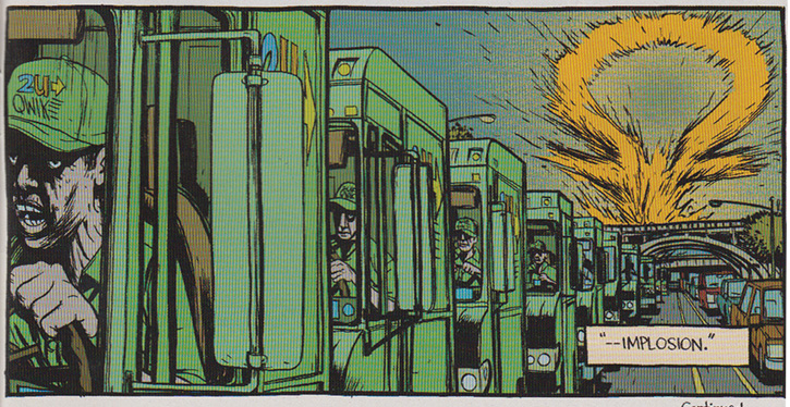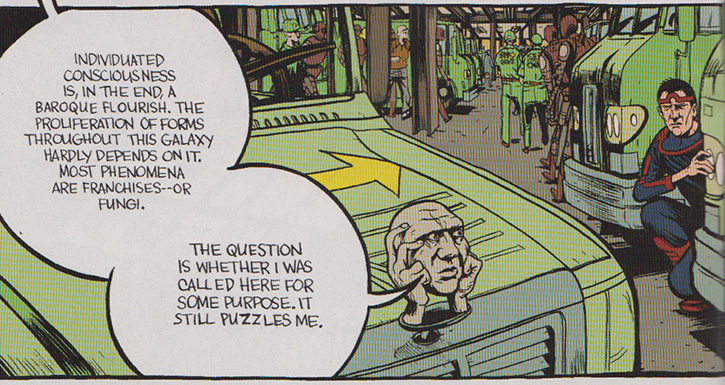 Meanwhile, the original man in blue has left the safety of Reverend Upchurch’s place and made his way to the 2U Quik warehouse as well. He is desperately fighting dozens of the robots to get Alex and Amandla but is never spotted before they get away. Crashing through the roof, he lands amid a tangle of robots in the garage, where the Overthinker—who has been narrating this part of the story—exists as a hood ornament on one of the delivery trucks. Until this point, the strange head with disembodied hands has been commenting on the action in broad and abstract ways, weighing “the baroque flourish” of an “individuated consciousness” against “franchises — or fungi” as a way to organize life. But suddenly, the Overthinker’s meta-role as narrator and Greek chorus is set on a collision course with the narrative itself, as Omega notices him in hood ornament form and the O-thinker freaks out because they “dwell in incompatible realms.” By way of desperate explanation, he exclaims, “You’re a creature of matter, while I am comprised of Doesn’t-Matter.” When Omega grabs hold of the Overthink ornament, this play on the ideas of matter and anti-matter manifests in an omega-shaped blast from the exploding warehouse that Dalrymple draws in the background in the final panel depicting countless 2U Quik robot zombies driving a line of delivery trucks away from the scene of the fracas.
