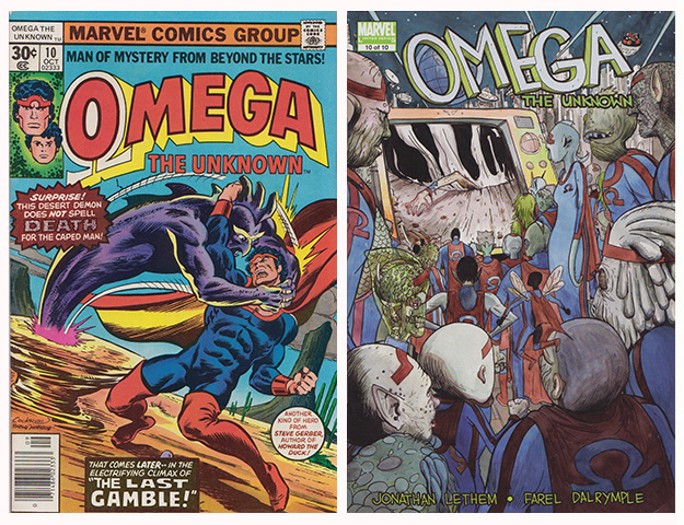 Farel Dalrymple’s cover for the 2008 version of Omega the Unknown #10, on the other hand, is probably the best of the series. It depicts countless varieties of alien “Omegas” gathered to watch a giant television broadcasting the caped man dragging an emaciated arm out of a smoking hole. In the background is an alien cityscape. The colors are bright. The details are eye-catching. I love it…but… well, it doesn’t really have much to do with the ending of the series. In fact, it has nothing to do with it. The ending is much more bizarre, but in a kind of a more mundane way than what is depicted here. I might have appreciated this cover even more if it had done more to incorporate some of the weirdness within.