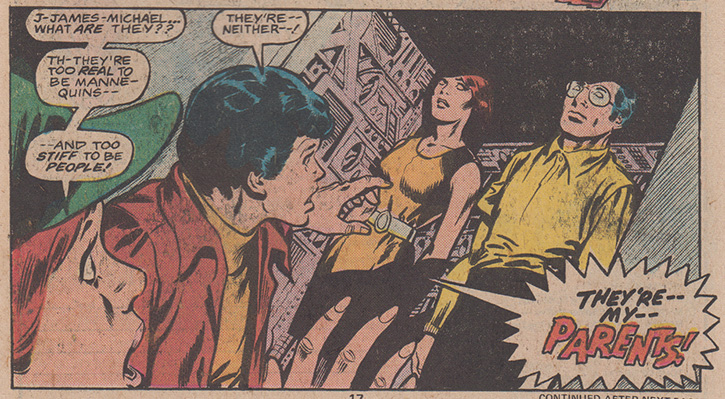 But what does he want all these ill-gotten gains for? Well, the narration that accompanies his angry pursuit of Ruby Thursday suggests that the money is for “an act of mercy” or “rescue operation.” It goes on to explain, “The boy — James-Michael — must be evacuated from Hell’s Kitchen immediately. Before his mind, his burgeoning emotions fall prey to its poisons.” If Gerber’s writing on Howard the Duck is anything to go by, I imagine this is meant to be a comment on the role of environment in shaping one’s sense of ethics and values. That’s great, but I can’t help but think of all the other kids stuck in Hell’s Kitchen, who don’t have a handsome superhero alien to finance their “escape.” Not only kids like James-Michael’s friend Dian, but unnamed black and brown kids who in this kind of framing are among the things to be escaped from. In other words, even as Omega the Unknown challenges some assumptions of the genre it recapitulates the most common framework for imagining and understanding urban spaces and erasing or dehumanizing those who are tacitly valued less than white protagonists, which it always centers.