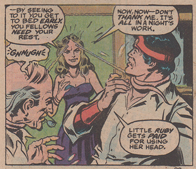Meanwhile, the caped man brings Gramps with him to Las Vegas, where he uses his powers to somehow fix games, so he and the old man start winning tons of money (but knowing enough to not win too much in any one place as to not draw too much attention). All in all, they end up with 55 grand after their first day of gambling (that’s over a quarter million in 2018 dollars). How does Omega pull off this trick of beating the house? There is no real explanation, just some nonsense about “the tarot card principle applied deliberately” and “the psyche acting upon the falling dice.” He talks a lot—way too much—in this issue. Before this non-explanation can finish, however, there is a knock on their hotel room door. A woman comes calling with a bottle of champagne. She claims to have observed their winning and has come to join the celebration. Yet, before our hero or Gramps can respond, two thin tendrils of flesh shoot out from her forehead and wrap around their necks. They pass out and soon her servant, Dibbuk (the cock’s comb demon from the cover) arrives, crashing through the window to carry off the money. It seems that this woman is not a woman at all (the head tendrils might have been a hint) and for a second the monster does not recognize her. This is important because later, when Omega awakens and goes after her—spotting the woman that came into the room driving off in a car—it becomes clear to the readers that this is not the same person. He had no way of knowing that the person who stole his money, someone named “Ruby Thursday,” had only taken the shape of this woman. Ruby Thursday first appeared in another Gerber-penned comic, Defenders #32 (February 1976), but her appearance here was the first time I had ever seen her, nor do we see her in her default “gumball head” form. Omega’s attack causes the innocent woman to crash her car and as he pulls her from the burning wreckage, demanding to know where the money is and threatening her, the police arrive. They try to subdue him and he easily flings them around, so then the cops open fire. The final panel of the final issue of Omega the Unknown depicts the caped man lying dead on the streets of Las Vegas, a note from “Steve, Mary, and Jim” that the story would be “concluded in a future issue of The Defenders.”