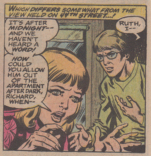 Back in Hell’s Kitchen, while Ruth, Amber, and Richard Rory discuss what to do about James-Michael’s absence. Ruth freaks out about the kid being out there alone after dark (perhaps forgetting when her callous attitude drove him out of the apartment late one night back in issue #6). Amber has the best approach, wait patiently for JMS to call since he is “nothing if not responsible.”