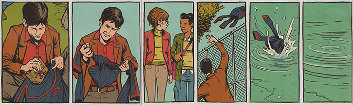 Alex tosses his Omega costume and the Book of Omega explaining the history of these super-beings into the reservoir.