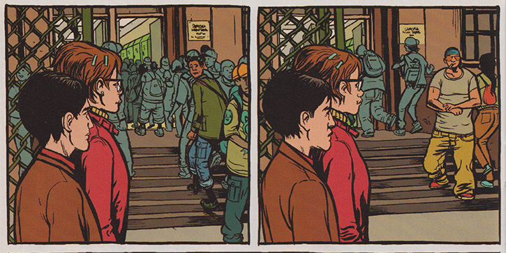 More silent panels continue, now turning to Alex, Amandla, and Fenton returning to the scene of the implosion. They flee some cops who spot them (I guess the authorities want to question Alex about his role in all these shenanigans) and end up at the reservoir—presumably where John Nedley shot himself after being bullied by Roofee and his crew. Here, Alex ties up the Omega tome in his superhero costume and tosses both into the water. Walking back past the same cops they saw before, the police no longer seem to recognize him. The three walk to a soda shop (not unlike the one that James-Michael and Amber frequent in the original volume) and enjoy some drinks (but we do see Fenton surreptitiously add some of the miracle salt to a nearby customer’s meal). Eventually they drop Amandla back at school, where we see Roofee—apparently fully recovered from his beating in issue #4—pausing to stare at Alex. But the story moves on: Amandla is left behind to deal with the dangers and obstacles of life as usual. Alex and Fenton make their way to Columbia where they walk in on Clare Weiss the social worker getting frisky with Dean Quiller. And finally, Fenton leaves Alex at the robotics department with a kiss on the cheek that leaves him stunned. Crawling under the police tape, we last see the mysterious boy working on building a robot of his own. It looks like he is rebuilding his mother.