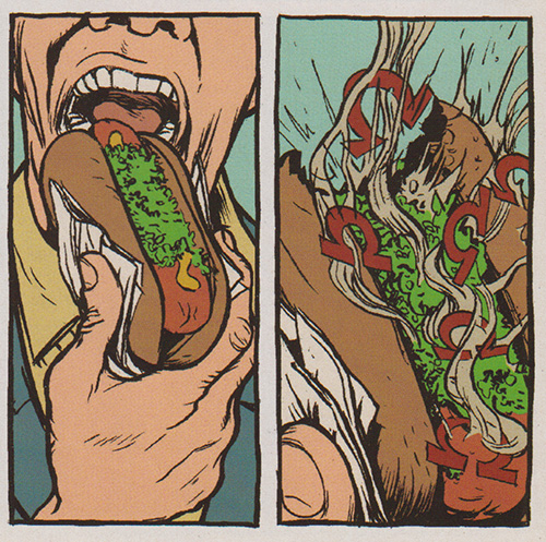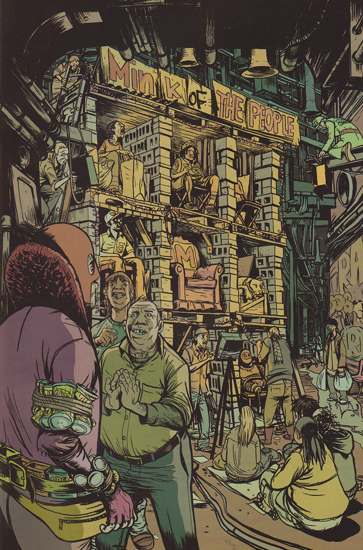 The opening pages depict the scene at the 2U Quik warehouse after the omega-shaped implosion that ended the previous issue. Against the backdrop of tabloid TV news reportage about the Mink being missing, Omega being a suspect for the explosion, the discovery of a “mechanical man” at the scene, and asking questions about the connection between Alex and the caped man, we see the caped man himself, having pulled himself naked and steaming from the omega-shaped hole left where the warehouse use to be. As the silent panels continue, we see him weakened and emaciated, stumbling through the streets and befriended by a tap-dancing street person who brings him to live among a homeless community and eventually down to the tunnels beneath the city in which the “Mole People” have long lived according to New York City legend. (And when I say “mole people” I don’t mean the moloids from Fantastic Four comics, I mean homeless people who dwell under the city). This view of what happens to the former hero transitions to scenes of food carts making contact with Reverend Upchurch’s food truck in order to get the inoculating salt that wards off the robot infection. As a business man eat a New York City dirty-water dog, we see Omega symbols emanating from it.