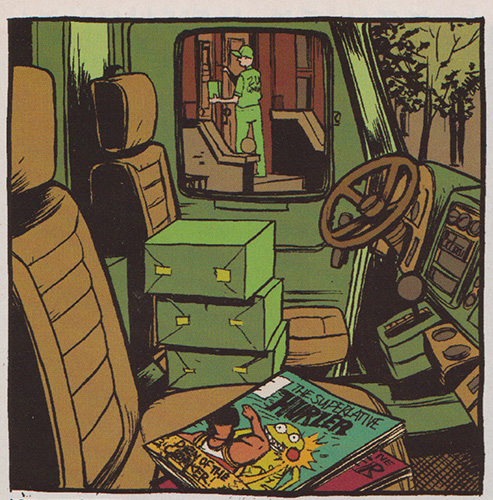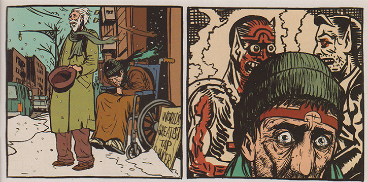 The caped man ends up disabled, homeless, and abusing booze, which leads to flashbacks of Gary Panter’s art.