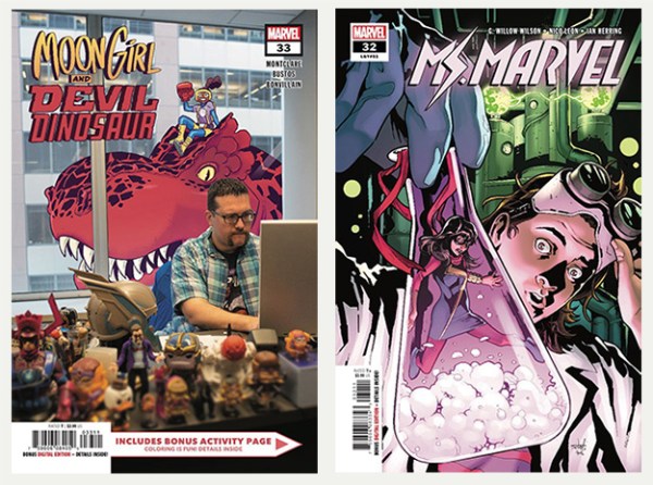 Current Pull-List: Dark Horse: Black Hammer: Age of Doom, The Quantum Age; DC: DC Nation, Mister Miracle; Fantagraphics: Love and Rockets; Image: Bitch Planet, Fix, Monstress, Paper Girls; Lion Forge: Astonisher; Marvel: Black Panther, Captain America, Exiles, Marvel Two-in-One, Moon Girl and Devil Dinosaur, Ms. Marvel, Runaways.