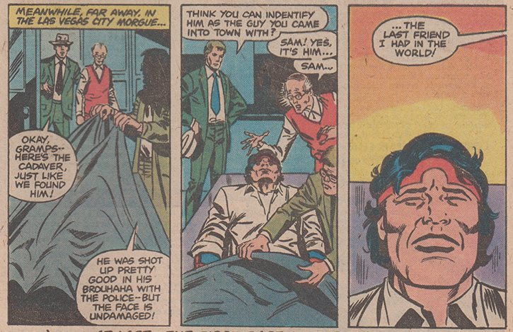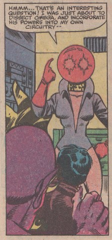How did the corpse get there? Well, last we saw, Ruby Thursday—a recurring villain from Gerber’s days as main scribe for the Defenders and who robbed Omega and Gramps in Omega the Unknown #10—was getting ready to dissect the body, which her servant Dibbuk stole from the city morgue. Yes, it looks like police bullets accomplished what Electro, the Hulk, El Gato, Blockbuster, and Nitro could not do, kill the caped man. What was not revealed in that final issue but is revealed here (and already well-known to long-time fans of the Defenders), is that Ruby has a shape-changing red bowling ball for a head. Of course, those already a familiar with the character know her head is some kind of polymorphic supercomputer, but that is not explained here. So, any fans of Omega dipping into just these issues just to find out “how it ends” might have been confused. I haven’t spent too much time thinking about Ruby Thursday because I haven’t read too many comics featuring her (and know her best from recent episodes of Titan Up the Defense), but something about her featureless blood-red head and curvaceous woman’s body is really distressing. It makes her very womanliness seems inhuman, like her body is literally objectified in association with the featureless perfectly round head. Trimpe chooses here to give her two red pinpricks of light for eyes hovering at the edge of what would be her face, but as far as I know, that is not how she is typically drawn.