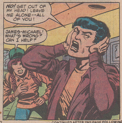 When I first read this, I thought that James-Michael had transformed into an adult wearing the Omega suit and it put me in the mind of when Titus Alexander Island dons the suit in Omega the Unknown volume 2, #9. But I was quickly disabused of this when I opened the next issue.