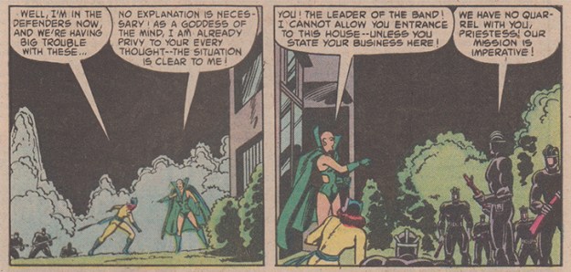Despite her imperious affect, Moondragon does what none of the Defenders thought to do, parley with the robots and try to find out what is going on and why they are attacking James-Michael.