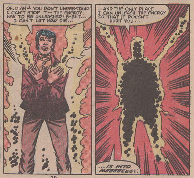 After seeing this story play out in his mind, James-Michael is angrier than ever and in denial of this truth, threatening to destroy everything to keep from being tortured anymore. Which torture he is talking about is not clear, but I guess he just means the distress of being alive, that generalized angst that emerges from the adolescent realization of just how endlessly shitty life can be. Fortunately, for the Defenders and the Earth, in that moment an injured Dian comes crawling out of the wreckage of the quinjet, begging him not to kill her. As suddenly as the taciturn boy turned maniac, he changes again. Realizing he does not want to be responsible for his friend’s death, he turns his power on himself and disintegrates before Dian’s eyes. Omnipotent adolescent angst is resolved through noble suicide, not a very thoughtful message for a genre ostensibly aimed at young adults.