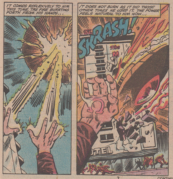 Spotting the robots’ ship, James-Michael blasts it out of the sky with his Omega beams, and it smashes into the side of hotel, causing carnage. Gone is the sensitive and thoughtful JMS. All that remains is a tantrum-throwing 12-year old brimming with destructive power.