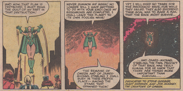 I had no contact with Steve or Mary; like I said, he was estranged from the company at the time, & likely wouldn’t have been eager to help anyway. It was several decades before Steve & I met, but we became pretty good friends. He didn’t hold a grudge about it. No, I had no idea (well, I had some from the context, but not more than anyone else) what they’d planned to do with the character; Steve took that secret to his grave & Mary has never told anyone that I’m aware of. (I can tell you what he had planned for the Killer Elf in Defenders, though.) At the time, it seemed to me all the solutions the series pointed to – Starling is Omega’s younger self; Starling is Omega’s brother or son, etc. – were too obvious to be interesting. Steve was known for off-the-wall, so I went with the most off-the-wall I could come up with. Looking back, it was probably not the right choice; I should’ve erred on the side of clarity. Sorry about that.