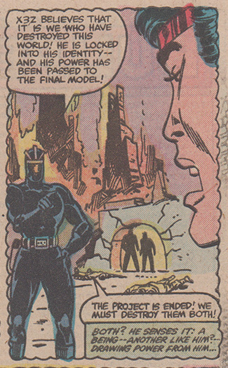 This apparently worked for the first two iterations, but when the man sometimes called Omega was inserted into a world that looks suspiciously like Superman’s Krypton—populated by a race of technologically advanced people that the robots think are particularly suited to teach him “morality and nobility”—it all goes wrong. Omega grows up to be an honored part of their advanced warrior caste and as such has taken a vow of silence (a throwaway detail apparently meant to explain his reticence to speak for most of the 10 issues of his series). He is elected by his people to be the recipient of a new power they’ve developed that taps into the world’s energy, not knowing it would not only destroy their own world, but that when Omega’s information was passed on to the final being in the chain the robots created, James-Michael would also come to possess the power and destroy the Earth as well. Upon discovering this series of events were imminent, the robots rush there in hopes of stopping the transfer of power.