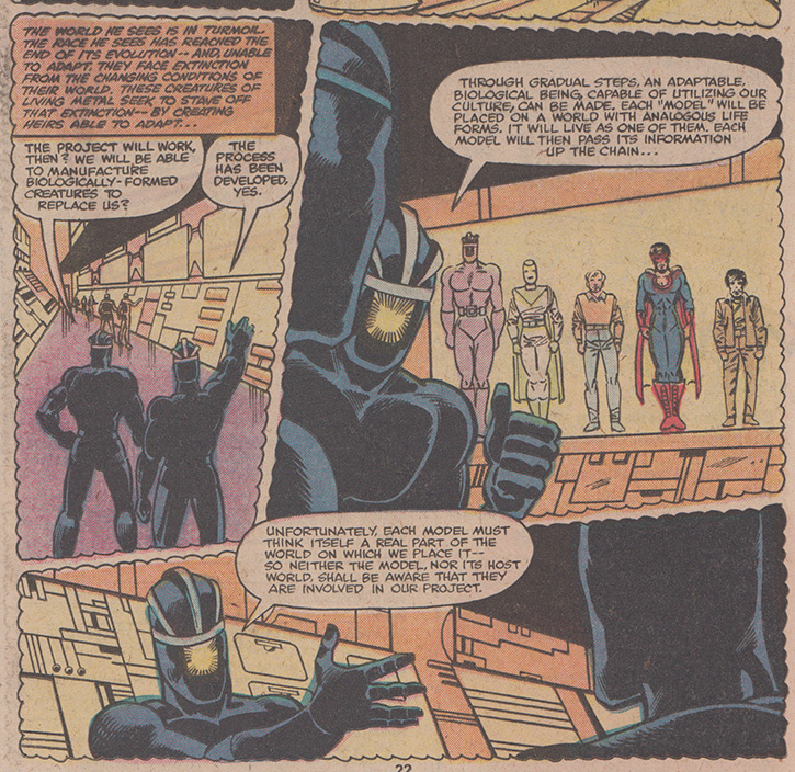 The living robots are of a race of aliens who had “reached the end of evolution” (a common superhero comic book bullshit concept that reveals a lack of understanding of how evolution works). In order to stave off extinction, they design biological creatures able to adapt to new environments. The idea being that these beings will be inserted on other worlds to live among analogous creatures gathering “information,” which is then passed on to the next model of biological creature who is sent to live among other analogous creatures. This will somehow save them, though it is not clear how. We see the robots discussing the plan in front of a screen showing a line of being starting with the robots and ending with James-Michael Starling. Between them are three humanoids of vague distinction, except for the one closest to JMS, who is of course the caped man. One robot conveniently explains to the other (and thus to us and to James Michael, who is seeing this through the mind-link created by Moondragon) that in order for this artificial evolution to function, the beings they’ve created must think themselves an actual part of the world they have been inserted into.