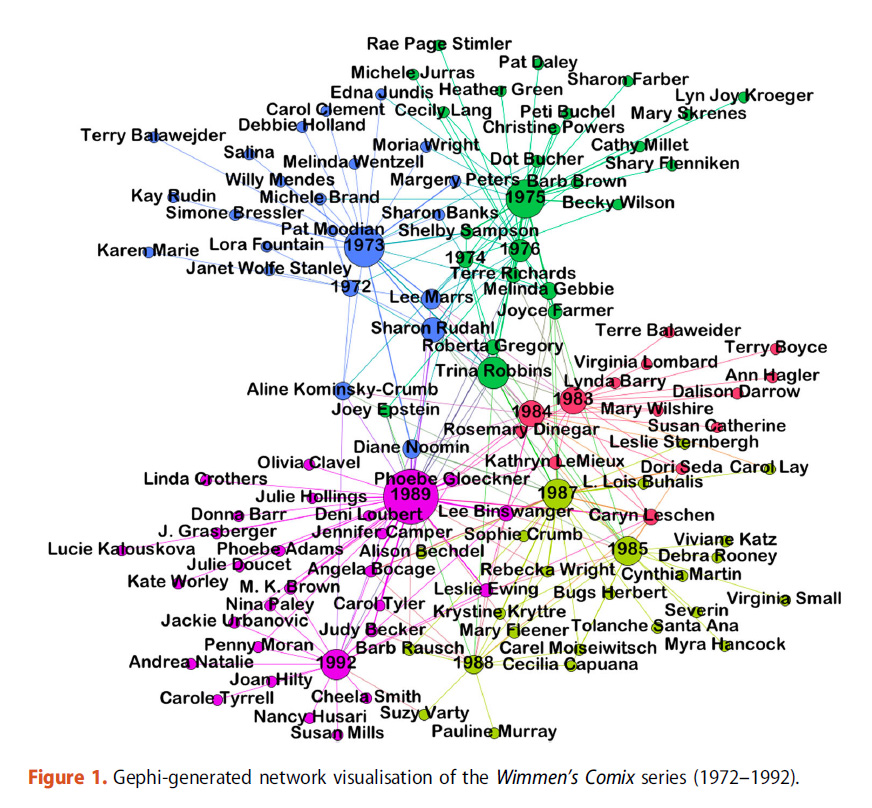 Gephi-generated network visualization of the Wimmen’s Comix series (1972–1992) by Margaret Galvan (originally published in Australian Feminist Studies) [click to enlarge]