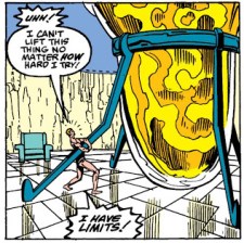 In Secret Wars II, when the Beyonder creates a (male) body for himself, he later decides to learn what it is to be human by establishing limits for that body (from Secret Wars II #9 [March 1986]) Words by: Jim Shooter. Pencils by: Al Milgrom.