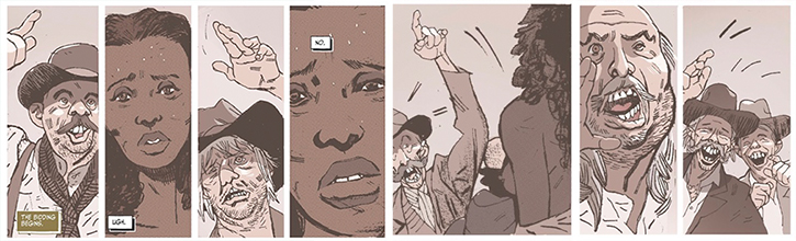 From the outset of the flashback sequence, we see the ways that enslaved women endured sexual violence. Broomhilda stands on the auction block as the auctioneer exposes her breasts stating, “Fellas, you ain’t felt gentle till you felt nigger gal gentle.” Scotty looks on lustfully. The next panel shifts the focus from sexual exploitation to physical violence as the auctioneer displays Broomhilda’s scarred back and the “r” branded on her cheek. These images cause Scotty to “react with repulsion.” These six panels display, in full detail, the pervasive culture of sexual violence that enslaved women endured. As Alice Walker writes regarding this culture,