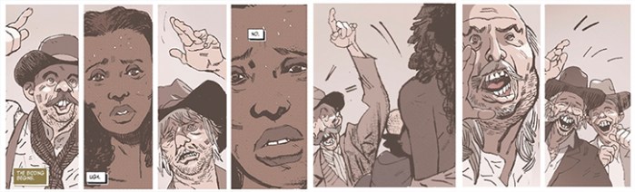 We see Broomhilda, but we do not hear her. What does this do for readers? How can the horrors and violence that enslaved women endured be represented visually—specifically in sequential art—in such a way that does not render them voiceless and that does not exploit or dehumanize them through sexualized and violent images? These are questions that arise when reading something like Django Unchained. It may be credible to show the violence, both physical and psychological, enacted upon enslaved individuals, but when does that representation work challenge this history and when does it reinforce wide-held beliefs?