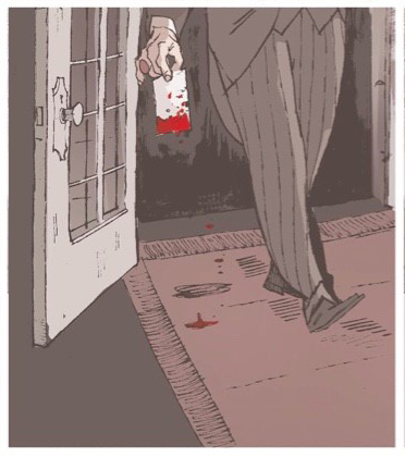 Two panels show the bloody bill of sale, and each of these panels recall the opening of the sequence. In one panel, we see Scotty’s body draped over the table with blood splattered on the deed. Here, naïve Scotty from the beginning of the sequence who does not quite grasp how the “rules” work, lies dead and his blood stains the paper representing his relationship to Broomhilda. Rather than a marriage license, a bill of sale bonds him to the woman he “loves.” The next panel shows Candie’s feet walking through the door of the hotel as he holds the bill of sale between his fingers. Blood drips from it. Again, the bill represents a white slave owner’s relationship to Broomhilda, and the symbolic nature of the blood brings to minds the ownership of her body and that sexual violence again awaits her, asking readers to consider what the real difference, if any, might be between their ownership.