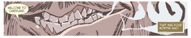 About three months later Scotty and Broomhilda head into town for what Scotty views as a romantic getaway. In these panels, Scotty smiles broadly as he walks through the streets of Greenville with Broomhilda on his arm. However, Broomhilda’s countenance shows sadness, especially when she sees enslaved people being led through the streets under clearly dire circumstances. The two end up at Candie’s Cleopatra Club (where in the film Schultz and Django first meet the slave owner). Scotty starts playing cards with Candie, and eventually they reach the point where Candie wants to play for higher stakes, so he suggests that they bet their “property,” wagering Broomhilda against Candie’s slave Sheba. Scotty loses the hand. Scotty protests, Candie kills him and then barges into Broomhilda’s hotel room, chases her outside, and rapes her. This is the last image of the flashback and the narrative moves to a slave auction in the present where King Schultz tells Django that he has learned that Broomhilda is at Candyland.