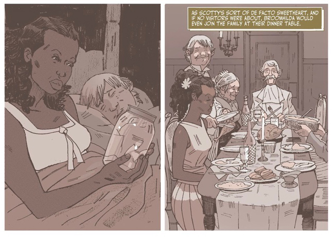 After the auction, Scotty and Broomhilda ride to the plantation in a wagon. Scotty offers her jelly beans and even invites her to sit beside him in the front of the wagon. Yet, once they arrive at the house, the provisional nature of her treatment is made clear. Scotty’s mother tells Broomhilda, “Boy’s twenty-four. He still ain’t a man yet. That’s why you’re here.” Scotty’s parents see Broomhilda as something for their son to practice his manhood on. Scotty, however, views her as a friend and a romantic companion. They chase butterflies together during the day and catch fireflies at night. As they chase butterflies, they are completely blackened against a bright background. In the next panel, we see them catching fireflies at night. Here, we see both Scotty’s and Broomhilda’s faces, each with a smile. After catching fireflies, Broomhilda holds a jar with the lightning bugs she has captured as Scotty sleeps peacefully next to her. Here, Broomhilda’s face shows a mixture of sadness and anger. She sees herself, as similarly trapped, living an existence as just a pretty object for Scotty to enjoy while she physically and psychologically suffocates from that captivity.