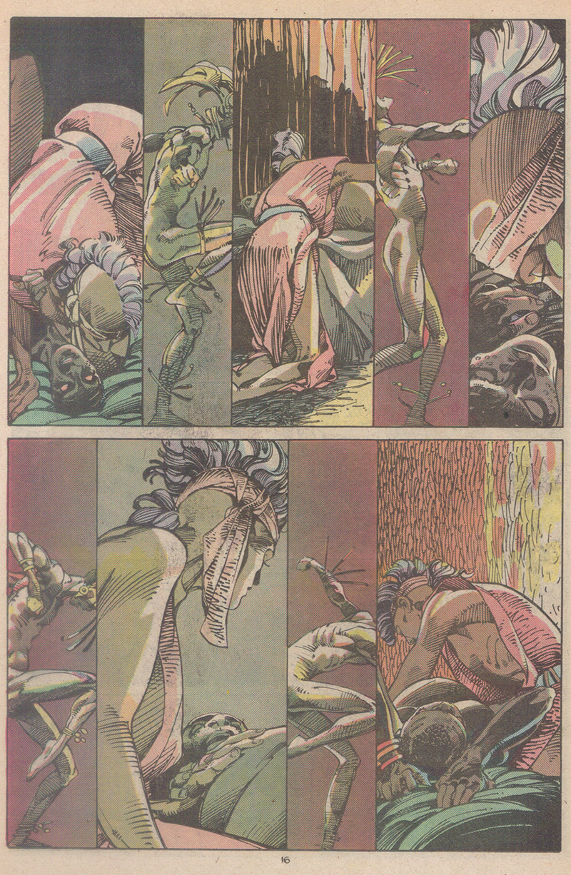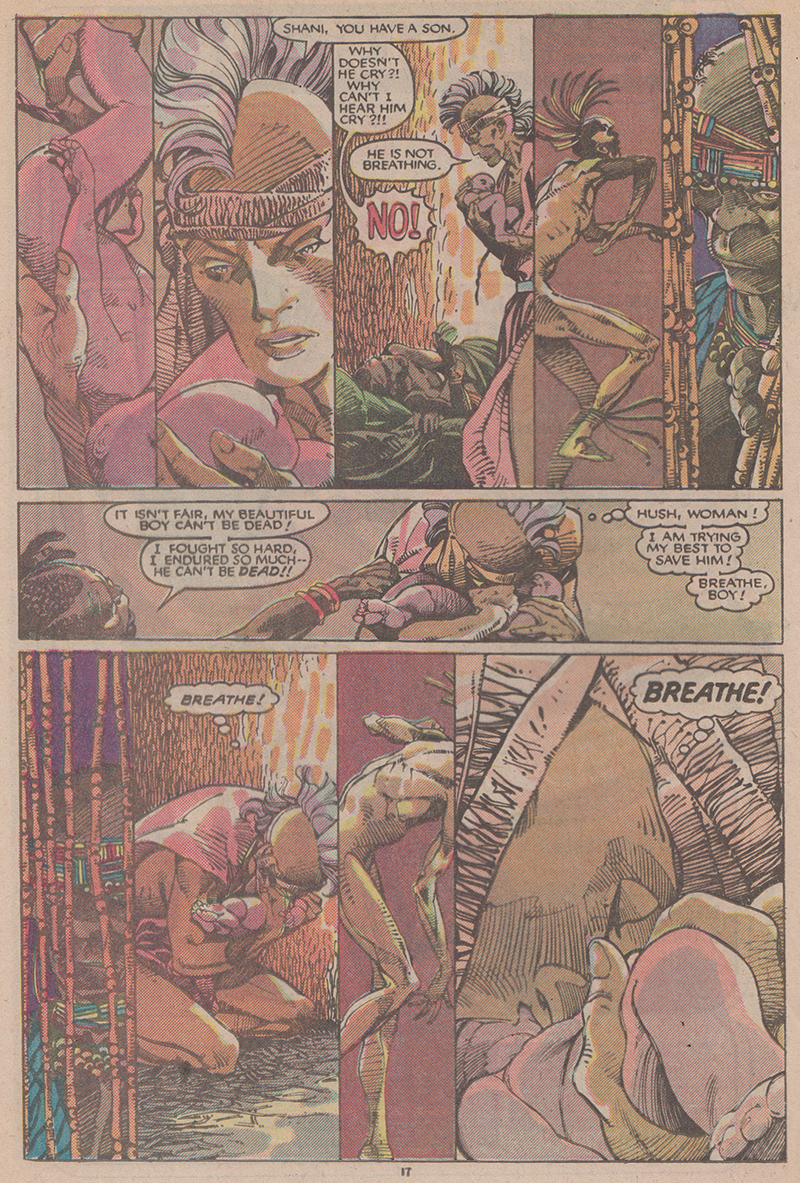 In 1984 and again in 1985 Chris Claremont and Barry Windsor-Smith joined forces to explore the X-Men’s Storm, who had recently lost her powers. The second of these stories, “Lifedeath II” (The Uncanny X-Men #198), shows Storm travelling through the east African desert and meeting Shani—a young, very pregnant local woman who only appears in this issue—in the remains of a car crash. Rescuing her, Storm returns Shani to her village. In the issue’s climax, Windsor-Smith composes two pages that entangle scenes of Shani giving birth with scenes of a tribal dance ceremony meant to offer Shani and her coming child strength. As Osvaldo Oyola notes in “Imperfect Storm (Part Two): Exploring ‘Lifedeath II’,” “The layout of the panels provides a sense of rhythm that evokes the musicality and desperation of the conjoined scenes (in a way that only sequential art can accomplish).” The long, narrow panels create a rhythm that corresponds both with the dance and with the breathing and pushing of labor. The lithe bodies of the dancers appear to move and stomp to an unheard drum. Two panels at the bottom of the page showing Storm aiding Shani are widened slightly, slowing the visual rhythm, evoking a longer push and the anticipation of the coming child. The narrow, visually staccato panels continue on the next page, though instead of a parallel between Shani’s labor and the dance, there is a rhythmic parallel between the dance and the CPR Storm administers to the unbreathing newborn.