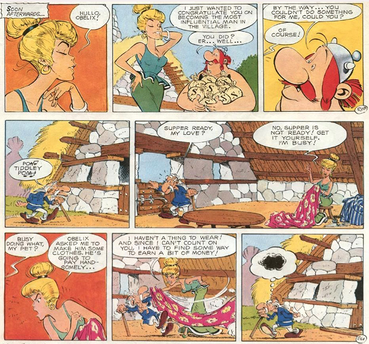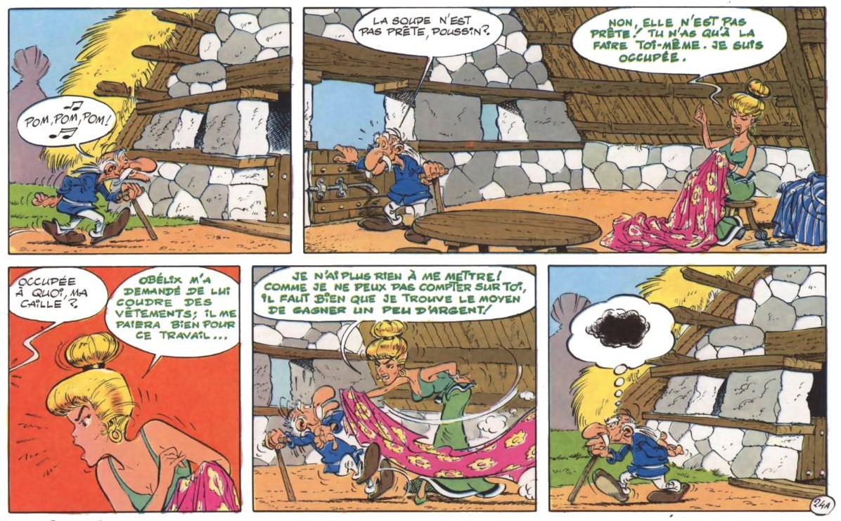 In the original French album (Fig. 1), Uderzo plays with the chromatic representation of sound in lettering to make the words come “alive” (as Moebius would put it), and convey the characters’ mood. In the first two panels, Mrs. Geriatrix greets Obelix in a sweet and flirtatious voice, as suggested by the pink-colored letters (27). In contrast, Obelix’s voice (and the balloon lettering) remain consistent with the standard black color, representative of his natural nonchalance and utter lack of receptiveness to her charms. On the following page (28), Geriatrix (aka Arthritix in the US) heads home to his sweetheart ready for supper, only to find that it is not ready. Mrs. Geriatrix, visibly annoyed as deftly suggested by the green-colored lettering, replies that she is too busy for cooking and he might as well do it himself. Interestingly, the British translation, highly praised for rendering the linguistic ingenuity of Goscinny’s scripts but perhaps failing a minute semiotic perusal, does not maintain this chromatic distinction (Fig. 2). The lettering in all balloons remains monochrome, thus losing the sound tone of the original, although the pictures still convey, albeit partially, the semiosis.